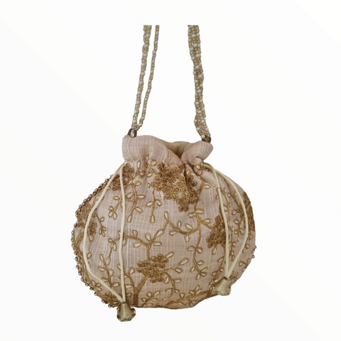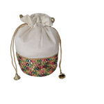 Bolso de tela bordado tipo bombonera con asa de hilo en color