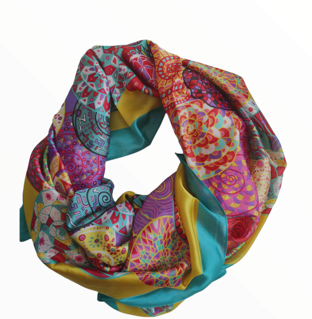 Pañuelo con el contorno en color verde agua y el fondo en amarillo. El estampado es en rosas, rojos, verdes, negros.....