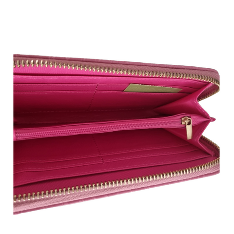 Monedero en color rosa con terminaciones en dorado. Cierre con cremallera.